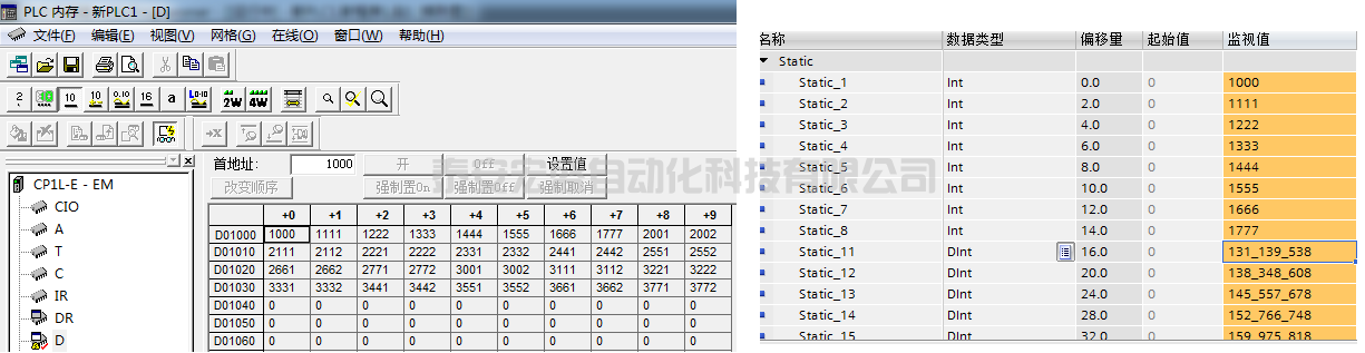再往DB6里面寫入幾個數(shù)據(jù),將網(wǎng)線還原,稍等一下,將筆記本的IP改回到1網(wǎng)段,通過歐姆龍的PLC軟件監(jiān)視一下看值有沒有過來,監(jiān)視效果如下圖: