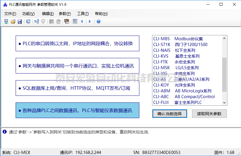 然后開始配置網(wǎng)關(guān),通過網(wǎng)關(guān)的參數(shù)設(shè)置軟件(下載地址)搜索到網(wǎng)關(guān)模塊后,讀取默認參數(shù),在'功能'->‘類型與設(shè)備選擇’頁面的4種類型選擇最下面一項,點'確認當(dāng)前選擇'按鈕,切換為類型4,系統(tǒng)為CLI-MEX,即多設(shè)備數(shù)據(jù)交互模式,如下圖,然后通過'參數(shù)'->'參數(shù)寫入到網(wǎng)關(guān)'下載參數(shù)后重啟: