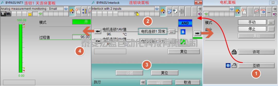 對(duì)于OS側(cè),則只需執(zhí)行OS編譯,互鎖塊可不創(chuàng)建塊圖表,通過(guò)工藝塊面板中的互鎖按鈕跳轉(zhuǎn)即可。在互鎖面板中可詳細(xì)看到各連鎖是否正常,對(duì)于異常信號(hào)可進(jìn)行旁路操作。而且可從互鎖面板跳轉(zhuǎn)回工藝塊或連鎖管腳所互連塊的面板。