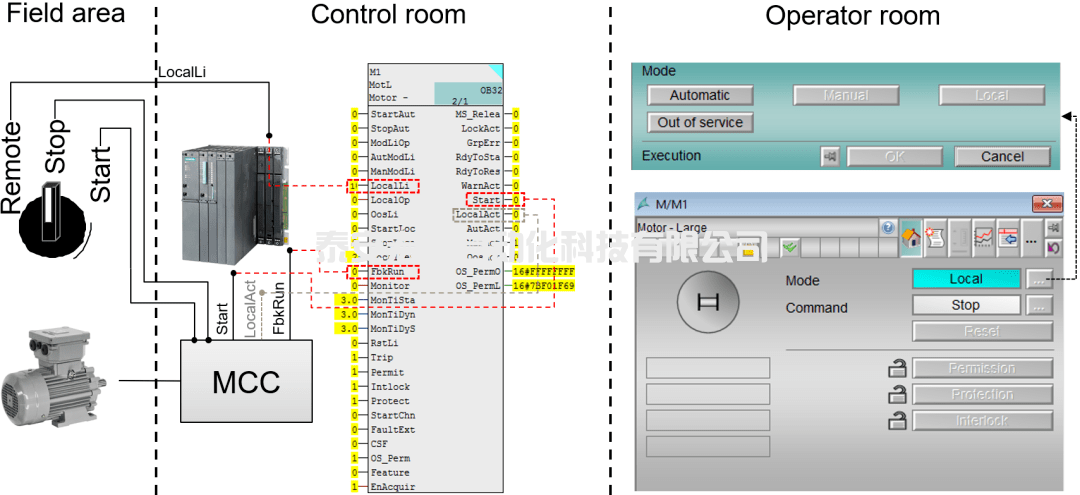 如果只是簡(jiǎn)單的應(yīng)用,其實(shí)我們只需要復(fù)制模板后連接運(yùn)行信號(hào)和控制命令就完成了下位機(jī)程序組態(tài)。執(zhí)行CFC和OS編譯后,在上位機(jī)上就會(huì)自動(dòng)創(chuàng)建了對(duì)應(yīng)的塊圖標(biāo)和面板。把對(duì)應(yīng)的塊圖標(biāo)放置到流程圖中對(duì)應(yīng)的位置,就這么簡(jiǎn)單的完成了上下位的組態(tài)。如果電機(jī)還涉及到啟動(dòng)允許、連鎖保護(hù),模板中也提供了三種連鎖,并且擴(kuò)展到了Interlock功能塊。借助于Interlock功能塊還能在電機(jī)面板中查看連鎖狀態(tài)、跳轉(zhuǎn)到連鎖面板旁通連鎖信號(hào)。