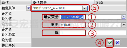 ②設置觸發(fā)事件,位變量支持"=True"和"=False",位序列和整數(shù)支持"=值"、"<>值",浮點數(shù)支持">值"、"<值"。