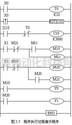 按照圖5-7提供的梯形圖,利用計算機或手持編程器寫入PLC。