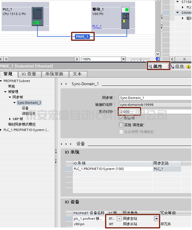 3. 在網(wǎng)絡(luò)視圖中配置PROFINET IRT通信,需要注意當(dāng)前V90 PN的通信時(shí)間最短為2ms: