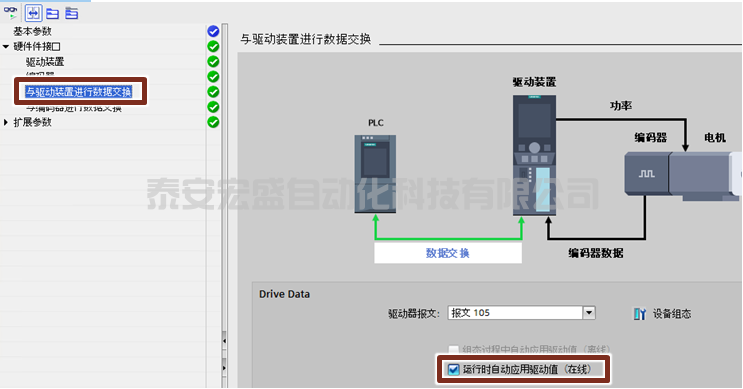 "與驅(qū)動(dòng)裝置進(jìn)行連接"中,數(shù)據(jù)交換和信息傳遞通過集成組態(tài)的形式可以實(shí)現(xiàn)自動(dòng)傳遞,默認(rèn)采用的報(bào)文為西門子105,勾選"運(yùn)行時(shí)自動(dòng)應(yīng)用驅(qū)動(dòng)值(在線)":