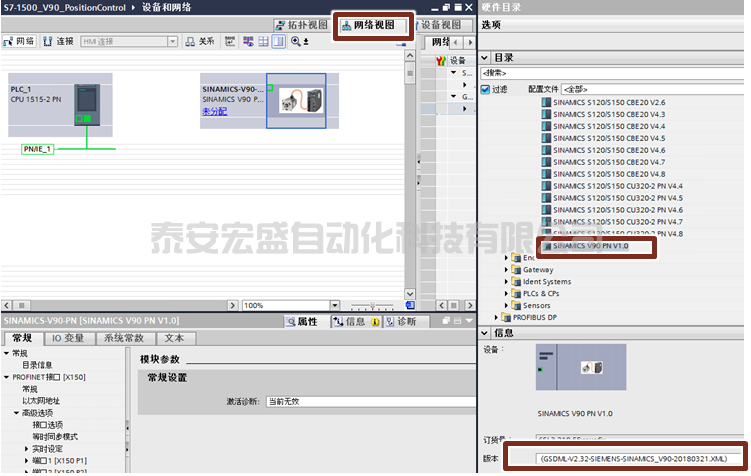 1. 創(chuàng)建新項(xiàng)目,添加新設(shè)備S7-1500 PLC,在網(wǎng)絡(luò)視圖中添加V90 PN設(shè)備