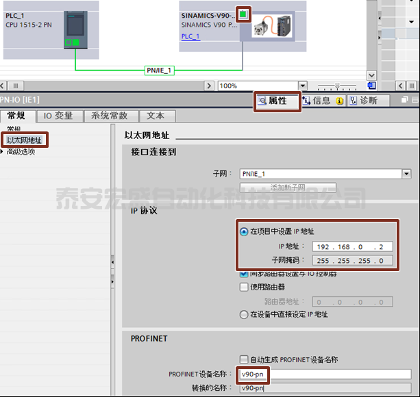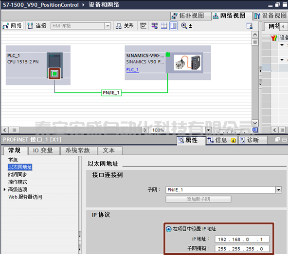 2. 建立V90 PN與PLC的網(wǎng)絡(luò)連接,并分別設(shè)置S7-1500及V90 PN的IP地址及設(shè)備名稱: