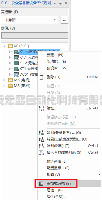 對(duì)PLC進(jìn)行編輯,首先應(yīng)打開(kāi)PLC的導(dǎo)航器來(lái)輔助進(jìn)行高效設(shè)計(jì),打開(kāi)方式:視圖→導(dǎo)航器→打開(kāi)命令下拉找到PLC數(shù)據(jù) (前提是需要打開(kāi)項(xiàng)目的圖紙頁(yè),否則視圖選項(xiàng)卡不會(huì)顯示)。在PLC導(dǎo)航器中選擇我們要操作的PLC模塊,如示例所示選中KF1,右擊選擇表格式編輯,即可在界面下方顯示該模塊表格式編輯的界面,如下圖所示。