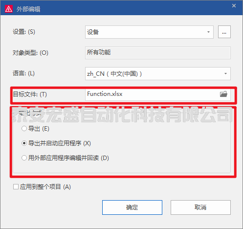 點(diǎn)擊“屬性”按鈕,即可打開(kāi)外部編輯導(dǎo)出的選擇對(duì)話框,如下圖所示。在此我們可配置輸出的語(yǔ)言、目標(biāo)文件名以及輸出的方式。
