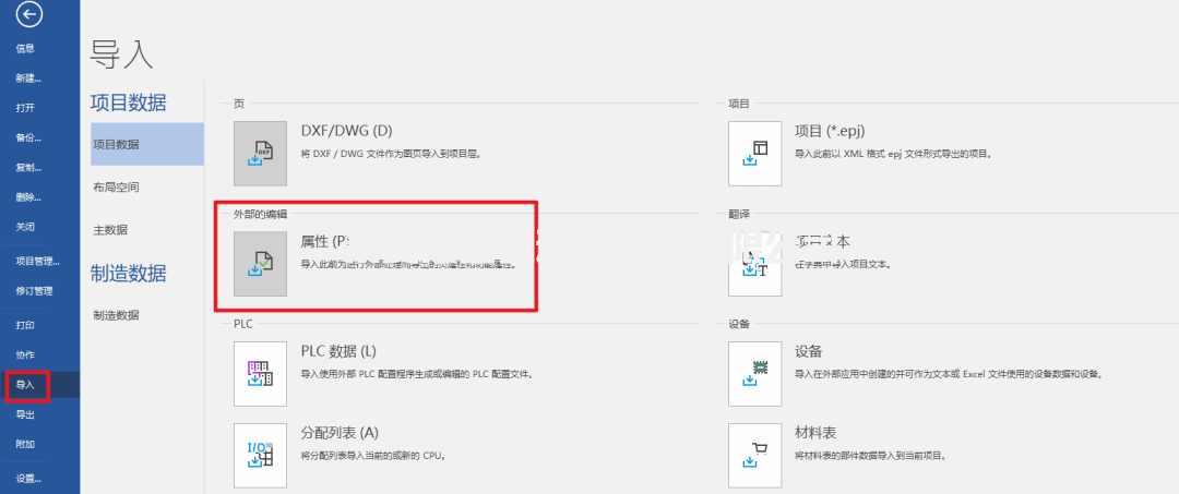 3. 執(zhí)行導(dǎo)入:選中當(dāng)前項(xiàng)目,打開(kāi)后臺(tái)視圖,點(diǎn)擊文件→導(dǎo)入→外部的編輯→屬性,如下圖所示。