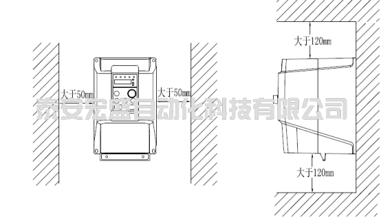 變頻器需要安裝在一個(gè)光滑的、垂直的、堅(jiān)固的表面,其上下左右與相鄰的物品或擋板(墻)必須保持足夠的空間。