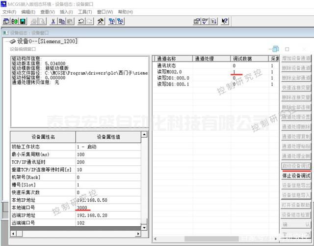 這個(gè)圖片上可以看到是西門子1200plc和觸摸屏通訊,通訊狀為0表示通訊正常,M002.0此時(shí)的值為1,是因?yàn)槲页绦蛑蠱2.0的值為1,也就是說啟動(dòng)設(shè)備調(diào)試后就能監(jiān)控到PLC程序中的點(diǎn)位實(shí)際值了,當(dāng)然這個(gè)圖片其實(shí)是監(jiān)控的模擬plc的值。---這個(gè)圖片上還需要說明的一點(diǎn)就是本地端口號,mscg是建議3000以上的值,初始打開這里可能是0,可能會造成通訊不上。