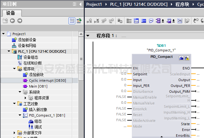 在“指令 > 工藝 > PID 控制 > Compact PID(注意版本選擇) > PID_Compact”下,將 PID_Compact 指令添加至循環(huán)中斷。