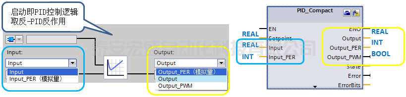 定義 PID 過程值和輸出值的內(nèi)容,選擇 PID_Compact 輸入、輸出變量的引腳和數(shù)據(jù)類型。