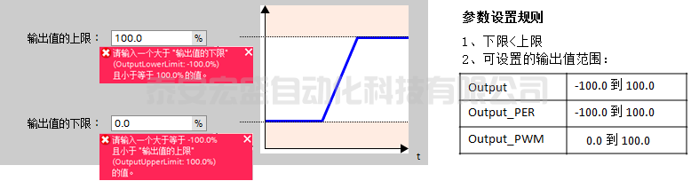 d. PID_compact 可以通過組態(tài)界面中輸出值的上限和下限修改限值。最廣范圍為 -100.0 到 100.0,如果采用 Output_PWM 輸出時(shí)限制為 0.0 到 100.0 。