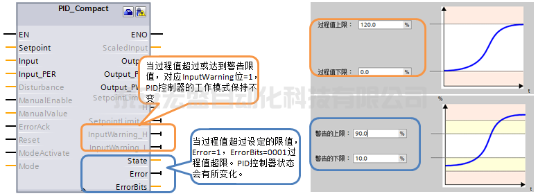 b. 過程值超過監(jiān)視限值,會(huì)輸出警告。過程值超過過程值限值,PID輸出報(bào)錯(cuò),切換工作模式。