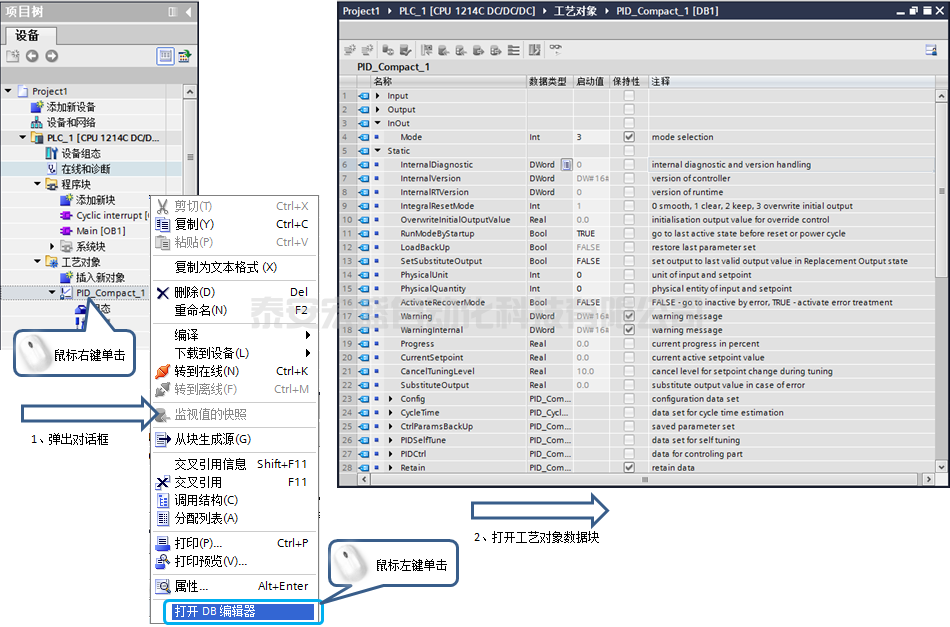 PID Compact 指令的背景數(shù)據(jù)塊屬于工藝對(duì)象數(shù)據(jù)塊,打開方式:選擇項(xiàng)目樹 > 工藝對(duì)象 > PID_Compact_x[DBy],操作步驟如圖所示: