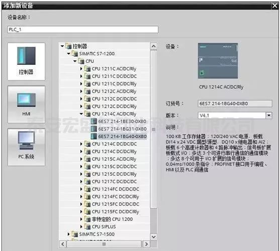 雙擊項(xiàng)目樹中的“添加新設(shè)備”,選中“添加新設(shè)備”對(duì)話框中的V4.1版的CPU 1214C AC/DC/Rly, 其PN接口的IP地址為192.168.0.1,子網(wǎng)掩碼為255.255.255.0。單擊“確定”按鈕確認(rèn)。