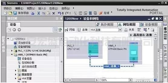雙擊項(xiàng)目視圖中的“設(shè)備和網(wǎng)絡(luò)”,打開網(wǎng)絡(luò)視圖。單擊“連接”按鈕,自動(dòng)選中“HMI連接”。用拖拽的方法連接HMI和PLC的PN接口,自動(dòng)生成HMI_連接_1。