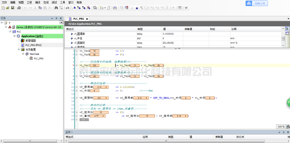 vi_VarA := 10; vi_VarB := 90; //-----加法指令的運用,運算結(jié)果100----------- vi_Var1 := vi_VarA + vi_VarB; //-----減法指令的運用,運算結(jié)果-80----------- vi_Var2 := vi_VarA - vi_VarB; //-----乘法的運用---------------------------- vf_圓周率 := 3.1415926; vi_半徑 := 8; //----8mm vf_圓面積 := vf_圓周率 * INT_TO_REAL(vi_半徑 * vi_半徑); //-----除法的應(yīng)用---------------------------- //-----已知 vf_圓周長 := 15mm,求直徑.-------- vf_圓周長 := 15; vf_直徑 := vf_圓周長 / vf_圓周率;