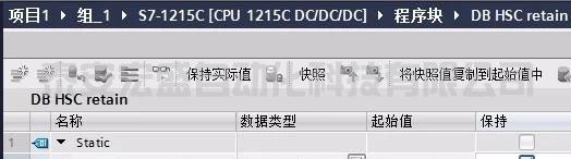添加一個新的 DB 命名為 DB HSC retain,并且創(chuàng)建一個DINT數(shù)據(jù)元素,命名為HSC_1用于保存高速計數(shù)器的值。為了實現(xiàn)這個功能,HSC_1通過勾選保持項實現(xiàn)數(shù)據(jù)保持。此外創(chuàng)建系統(tǒng)數(shù)據(jù)類型HSC_Count的變量Static_1用于CTRL_HSC_EXT指令。