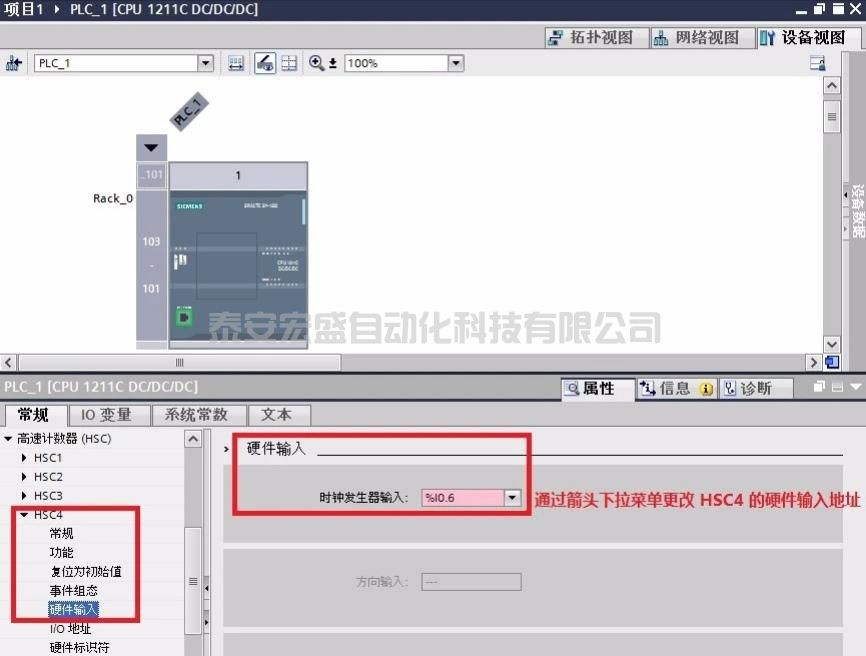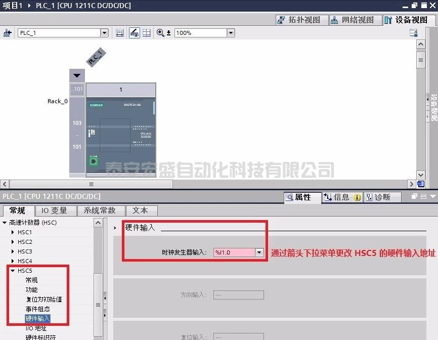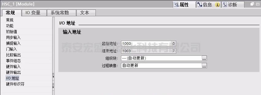 3在設備視圖>HSC_1>屬性>I/O地址,使用缺省地址1000作為高速計數(shù)器地址。