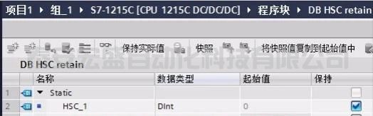 添加一個新的 DB 命名為 DB HSC retain,并且創(chuàng)建一個DINT數(shù)據(jù)元素,命名為HSC_1用于保存高速計數(shù)器的值。為了實現(xiàn)這個功能,HSC_1通過勾選保持項實現(xiàn)數(shù)據(jù)保持。
