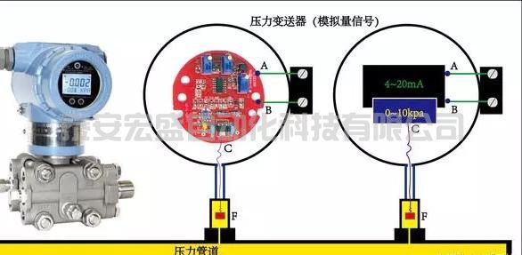 圖2中的器件叫壓力變送器。壓力變送器的內(nèi)部就是一塊電路板,電路板連接著一個(gè)壓力傳感器F。它的工作原理是壓力傳感器F把檢測(cè)到的壓力傳到電路板的C,檢測(cè)信號(hào)進(jìn)入電路板后,通過(guò)電路板的轉(zhuǎn)換與計(jì)算,把這個(gè)壓力信號(hào)轉(zhuǎn)換成一個(gè)電流信號(hào)由A和B這兩個(gè)點(diǎn)輸出。圖中右邊就是轉(zhuǎn)換過(guò)程的示意圖,它可以把一個(gè)0-10kpa的壓力信號(hào)轉(zhuǎn)換成一個(gè)4-20mA的電流信號(hào),由A和B這兩個(gè)點(diǎn)輸出。這時(shí)我們就說(shuō)A和B這兩個(gè)點(diǎn)輸出的就是一個(gè)模擬量信號(hào)。模擬量信號(hào)的特點(diǎn)是它的值是在一個(gè)數(shù)值范圍內(nèi)是連續(xù)可變的。