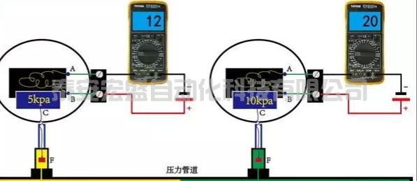 我們管道上安裝一塊量程為0-10kpa的壓力變送器,電源正極接壓力變送器的B點(diǎn),負(fù)極串聯(lián)一塊萬(wàn)用表到壓力變送器的A點(diǎn),并將萬(wàn)用表打到電流檔。當(dāng)壓力變送器C點(diǎn)的壓力是5kpa時(shí),萬(wàn)用表的的電流讀數(shù)是12mA。正好是4-20mA的電流信號(hào)的中間值,而5kpa也正好是0-10kpa壓力值的中間值。當(dāng)壓力變送器C點(diǎn)的壓力是10kpa時(shí),萬(wàn)用表的的電流讀數(shù)正好是20mA。這樣0-10kpa壓力值就對(duì)應(yīng)了4-20mA的電流信號(hào)值,我們只要在遠(yuǎn)方通過(guò)一個(gè)接受設(shè)備把這個(gè)4-20mA的電流信號(hào)值提取出來(lái),再通過(guò)一定的計(jì)算,就能知道就地的壓力值是多少了。