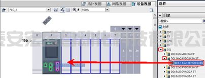6.成功插入PLC后,STEP 7 Professional V12 軟件會自動跳轉到設備視圖。接下來我們要做的是在主機架上依次插入一個16通道的數(shù)字量輸出擴展模塊和一個數(shù)字量輸入擴展模塊。首先,添加DQ模塊:在“設備視圖”右側的產(chǎn)品目錄中,依次點擊“DQ”、“DQ 16*24VDC/0.5A ST”左側的小箭頭展開項目樹,然后用鼠標點中訂貨號“6ES7 522-1BH00-0AB0”,按住鼠標左鍵不放,將DQ模塊拖拽到2號槽位上,松開鼠標: