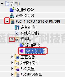 10.接下來我們開始編程:依次點擊軟件界面左側的項目樹中的“PLC_1[CPU 1516-3PN/DP]”、“程序塊”左側的小箭頭展開結構,再雙擊“Main[OB1]”打開主程序: