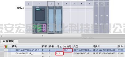 8.設備組態(tài)至此已經(jīng)完成,在項目視圖下方的“設備概覽”中,我們可以查看到系統(tǒng)默認分配的數(shù)字量輸出地址是QB0~QB1,數(shù)字量輸入的地址是IB0~IB1: