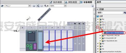 7.現(xiàn)在我們再插入一個DI模塊:在“設備視圖”右側的產(chǎn)品目錄中,依次點擊“DI”、“DI 16*24VDC HF”左側的小箭頭展開項目樹,然后用鼠標點中訂貨號“6ES7 521-1BH00-0AB0”,按住鼠標左鍵不放,將DI模塊拖拽到3號槽位上,松開鼠標: