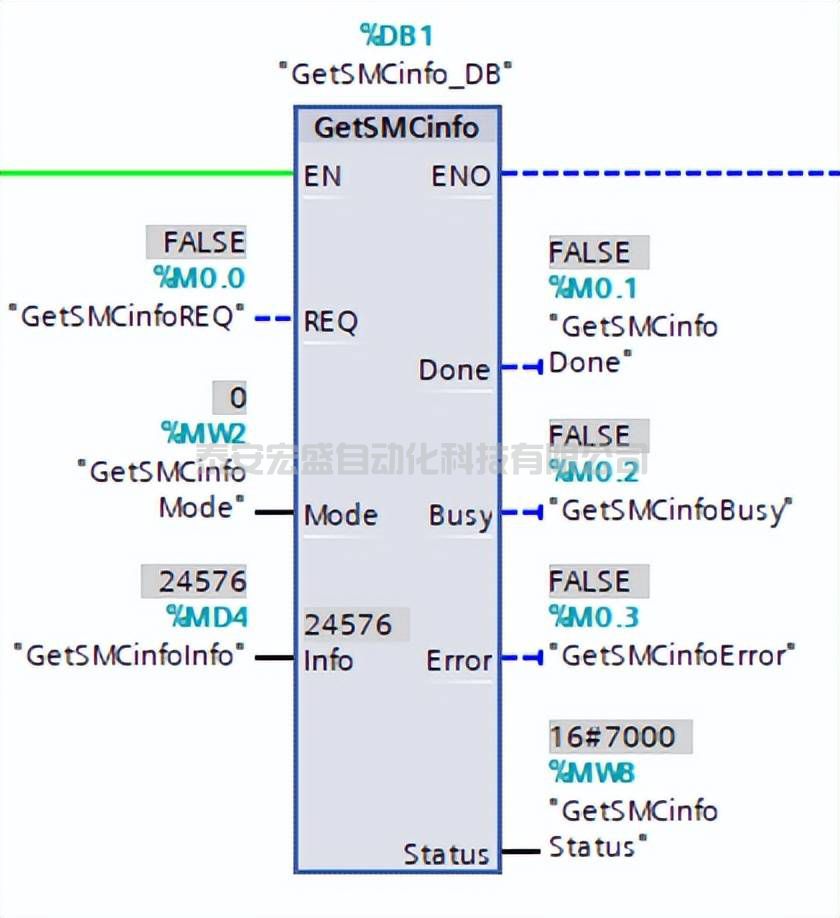 “GetSMCinfo”指令可檢索當(dāng)前所插入 SIMATIC 存儲(chǔ)卡的相關(guān)信息,Mode=0 時(shí),讀取存儲(chǔ)卡的存儲(chǔ)容量,如圖 7 所示,讀取到的 24MB 存儲(chǔ)卡容量為 24756KB。Mode 為 1 時(shí),讀取已用的存儲(chǔ)卡存儲(chǔ)容量。指令調(diào)用位置如圖 8 所示。