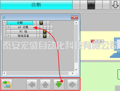 而對(duì)于上圖中的診斷按鈕,因?yàn)槠洚?huà)面樹(shù)包含子層級(jí)畫(huà)面,所以選擇該按鈕會(huì)顯示“診斷“畫(huà)面的同時(shí)“詳細(xì)信息”按鈕變?yōu)榭刹僮鳡顟B(tài)。此時(shí)點(diǎn)擊詳細(xì)信息按鈕會(huì)進(jìn)入到診斷的下一層級(jí)第一個(gè)畫(huà)面“AS對(duì)象“。如下圖所示: