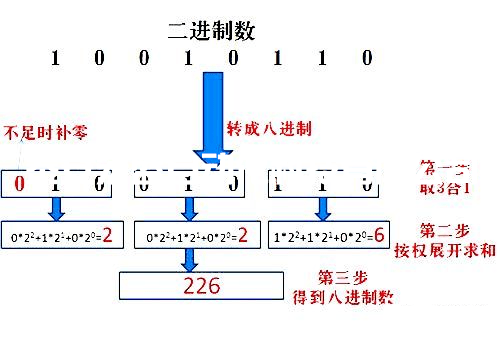 3位二進(jìn)制數(shù)按權(quán)展開相加得到1位八進(jìn)制數(shù)。注:3位二進(jìn)制轉(zhuǎn)成八進(jìn)制是從右到左開始轉(zhuǎn)換,不足時(shí)補(bǔ)0。如圖: