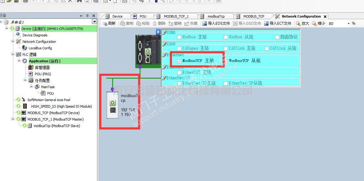 AM401做Client需要勾選ModbusTCP主站,即AM401做主站,1200為從站 從站端口設(shè)502