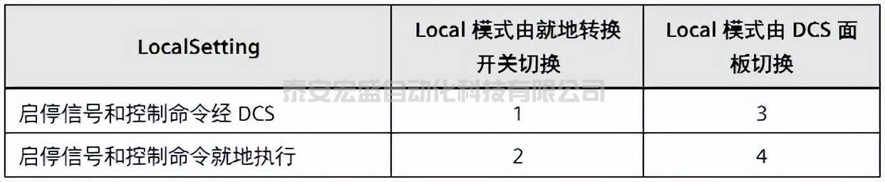 談到電機(jī)肯定會(huì)涉及到模式切換:就地、遠(yuǎn)程。遠(yuǎn)程/就地模式的切換及就地啟動(dòng)方式,各現(xiàn)場(chǎng)因?qū)嶋H電氣控制回路設(shè)計(jì)不同,需求也可能不盡相同。例如有的現(xiàn)場(chǎng)遠(yuǎn)程/就地切換通過(guò)現(xiàn)場(chǎng)轉(zhuǎn)換開(kāi)關(guān)實(shí)現(xiàn),就地啟停不經(jīng)過(guò)PLC,而別的現(xiàn)場(chǎng)同樣切換方式下可能就地啟停命令經(jīng)PLC發(fā)出。還有的現(xiàn)場(chǎng)遠(yuǎn)程/就地模式切換在DCS側(cè)面板中實(shí)現(xiàn),現(xiàn)場(chǎng)沒(méi)有轉(zhuǎn)換開(kāi)關(guān)。MotL充分考慮了這種需求,通過(guò)LocalSetting設(shè)置為不同的值可以滿(mǎn)足不同的應(yīng)用場(chǎng)合。如下表所示:
