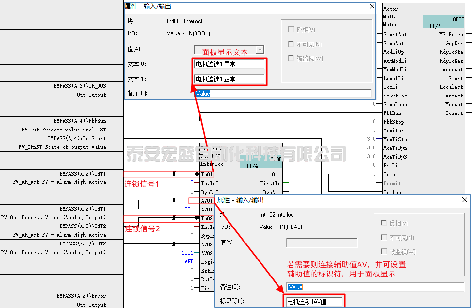 CFC中Intlk02的輸出Out和電機(jī)塊Intlock管腳互連,Intlk02的In01和In02連接連鎖信號(hào)(比如模擬量監(jiān)視塊的PV_AH_Act)。可為In01和In02指定上位機(jī)上顯示的文本即文本0和文本1的文本。若需要顯示連鎖信號(hào)相關(guān)的模擬值也可以連接AV管腳,并設(shè)置AV的標(biāo)識(shí)符用于上位機(jī)顯示。