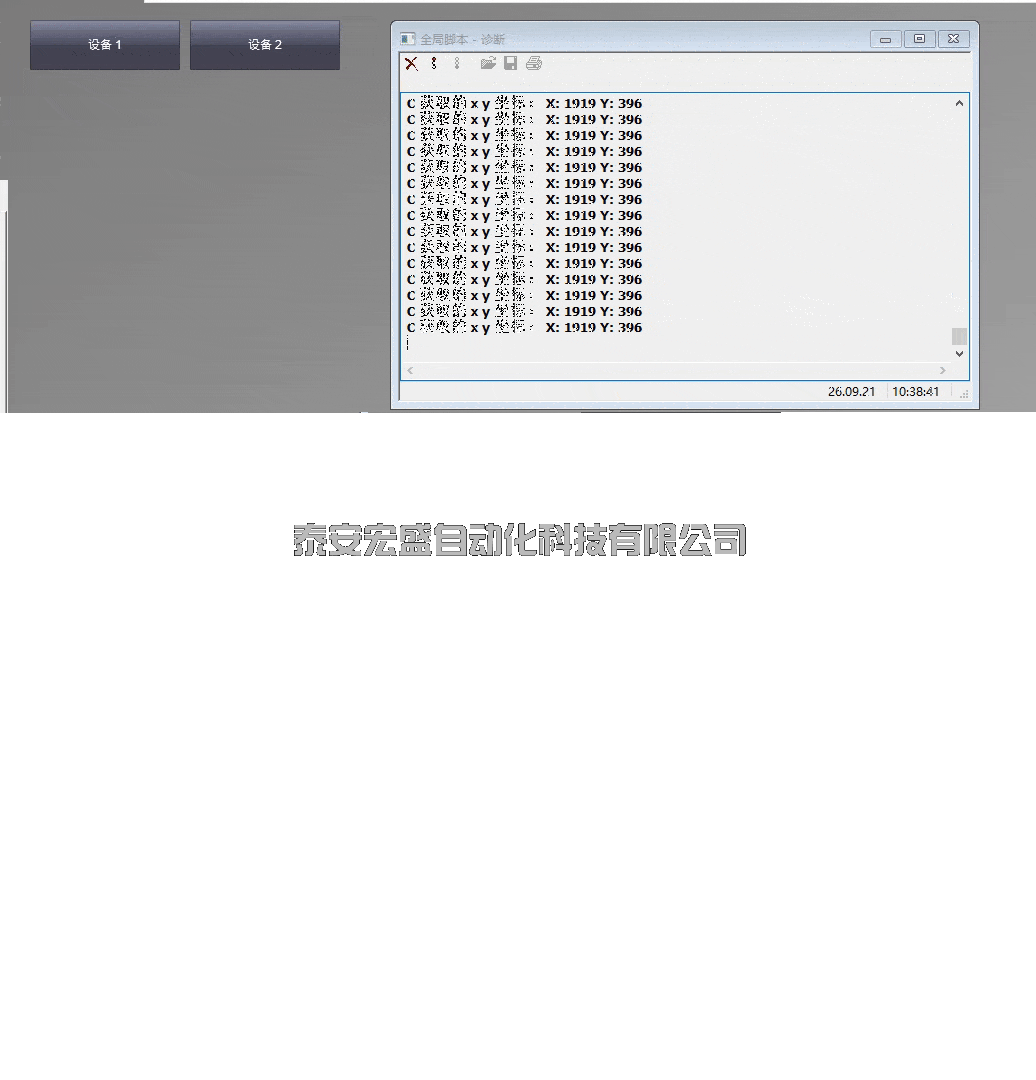 激活 WinCC 運行系統(tǒng)后,在畫面中鼠標分別按下兩個按鈕后,應用程序窗口中將會輸出鼠標按下時的 x,y 坐標值。