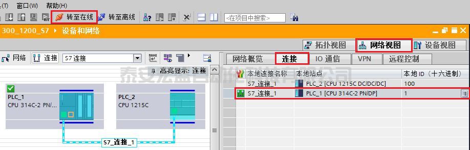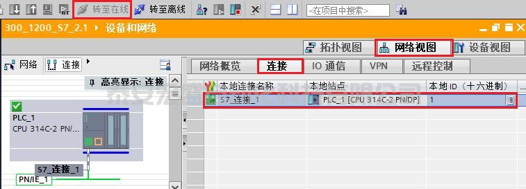 (1)配置完網(wǎng)絡(luò)連接,分別對 S7-300 和 S7-1200 編譯保存并下載。下載完成后,可點擊"轉(zhuǎn)至在線"按鈕,在“網(wǎng)絡(luò)視圖”的“連接”選項卡中查看連接狀態(tài),如圖 14 所示,本地連接名稱“S7_連接_1”左側(cè)有綠色標志,則表示組態(tài)的連接已經(jīng)成功建立。