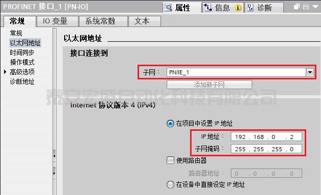 在 “設(shè)備視圖”中點擊 CPU 上代表 PROFINET 通信口的綠色小方塊,在下方會出現(xiàn) PROFINET 接口的屬性,在 “以太網(wǎng)地址” 下分配 IP 地址為 192.168.0.2 ,子網(wǎng)掩碼為 255.255.255.0,如圖 3 所示。