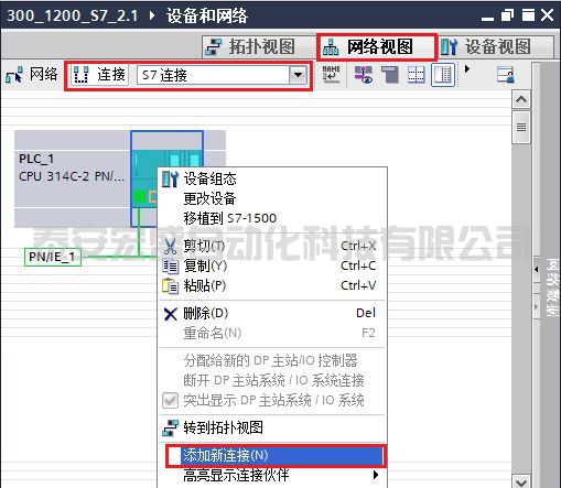 (1)打開 “網(wǎng)絡(luò)視圖” 配置網(wǎng)絡(luò),首先點中左上角的“連接”圖標,選擇“S7 連接”,然后選中 S7-300 CPU,右鍵選擇“添加新連接”添加新的連接,如圖 7 所示。