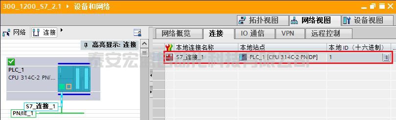 在網(wǎng)絡(luò)視圖下,用鼠標點中 S7-300 上的 PROFINET 通信口的綠色小方框,然后拖拽出一條線,到另外一個 S7-1200 上的 PROFINET 通信口上,松開鼠標,PN/IE_1的子網(wǎng)連接就建立起來了,如圖 6 所示。