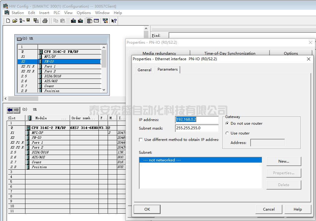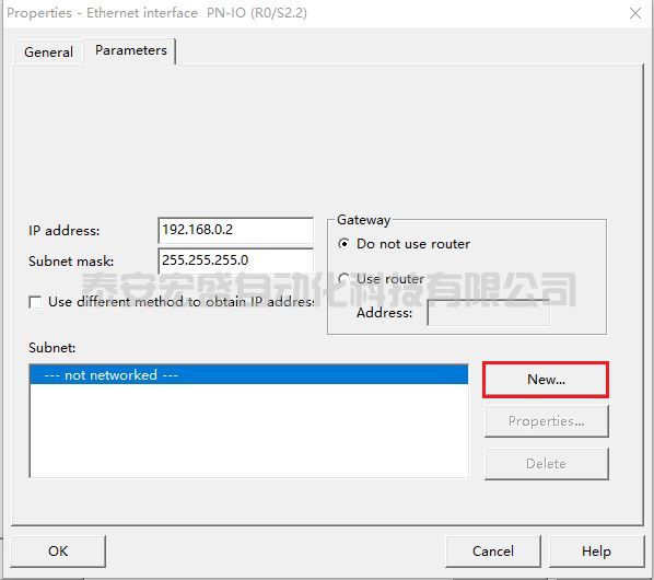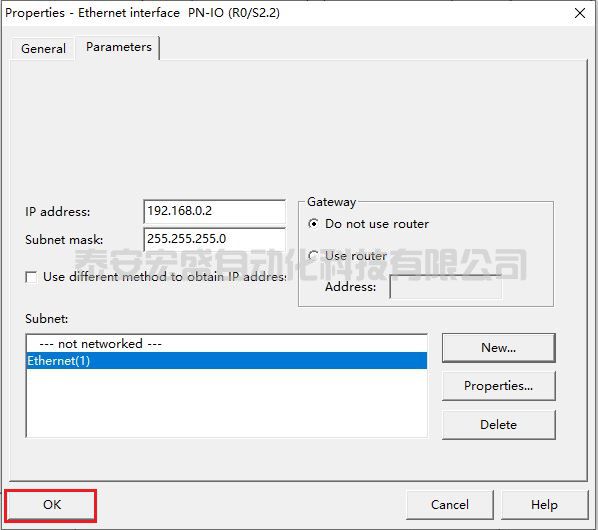 (7) 在彈出的“ Properties-Ethernet interface PN-IO”對話框的“ Parmeters”選項卡中為以太網(wǎng)接口設(shè)置 IP 地址192.168.0.2 和子網(wǎng)掩碼 255.255.255.0,如圖 60 所示。