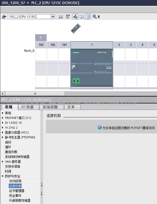 點開作為 S7 服務(wù)器的 S7-1200 CPU 的設(shè)備組態(tài),“屬性->常規(guī)->防護與安全”(V14 及以前是“屬性->常規(guī)->保護”)里“連接機制”一項需要勾選“允許來自遠程對象的 PUT/GET 通信訪問”(V14 及以前是“允許從遠程伙伴(PLC\HMI\OPC\...)使用 PUT/GET 通信訪問”),如圖 99 所示: