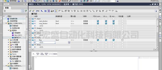 3.在FB函數(shù)塊的接口處定義三個(gè)變量,分別是啟動(dòng)按鈕、停止按鈕、啟動(dòng)標(biāo)志的三個(gè)形參,如下圖所示。