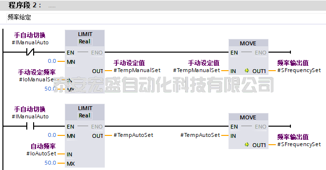 ②程序段2:當(dāng)HMI上的“手自動切換”按鈕FALSE時(shí),“手動設(shè)定頻率”生效,變頻器根據(jù)手動設(shè)定的頻率運(yùn)行;當(dāng)HMI上的“手自動切換”按鈕TRUE時(shí),變頻器根據(jù)自動設(shè)定的頻率運(yùn)行(可以根據(jù)現(xiàn)場的PID運(yùn)算等參數(shù)給定)。使用LIMIT指令是為了限制給定的頻率值在0-50HZ之間,假如“手動設(shè)定頻率”或者“自動頻率”的值小于0或者大于50,“#TempManualSet”和“#TempAutoSet”會自動限制在0-50之間。小于0則用0替代,大于50則用50替代。