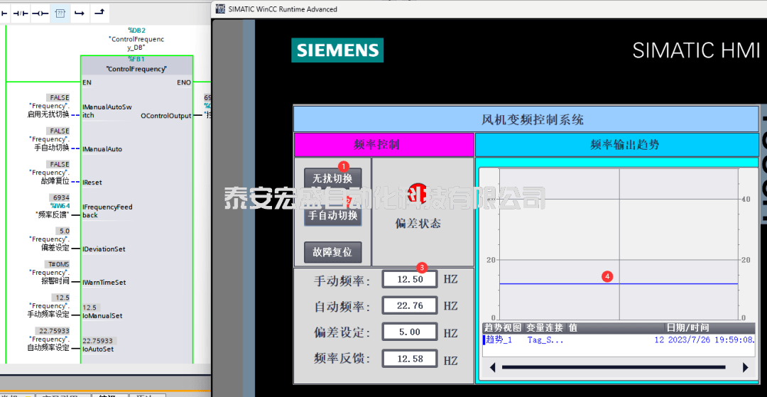 ①如圖1所示:HMI上“無擾切換”切換模式?jīng)]有啟用;“手自動切換”為FALSE,代表的是手動模式;手動頻率給定的是12.5HZ,頻率輸出曲線一直是在12.5HZ。當(dāng)切換到自動模式,如圖2所示,頻率輸出為22.76HZ,曲線可以看出頻率輸出產(chǎn)生了較大的擾動。