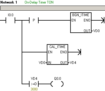 輸入點 I0.0 接通(上升沿) 3 秒后(3000 ms), 輸出點 Q0.0 置位。