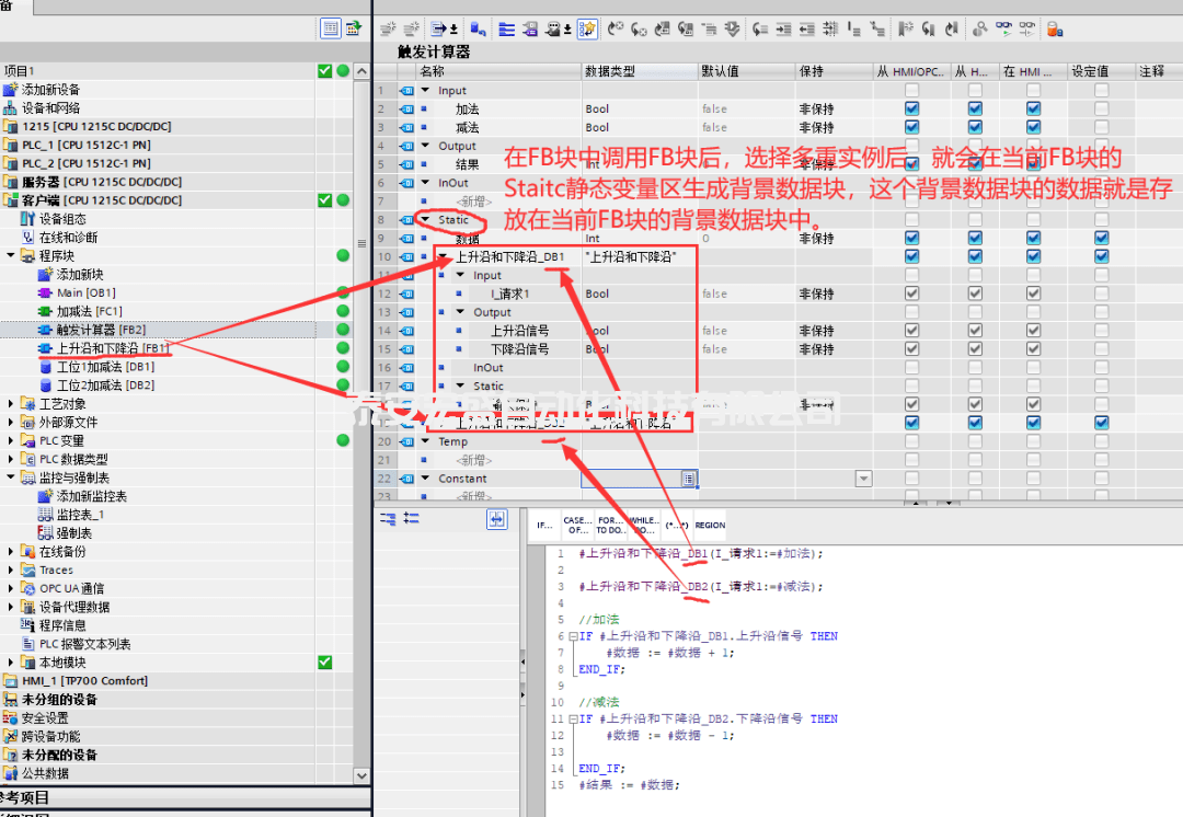 多重實(shí)例:比如,在FB塊中調(diào)用定時(shí)器時(shí),選擇了多重實(shí)例,那么改定時(shí)器的背景數(shù)據(jù)塊就保存在了當(dāng)前FB塊的Static中了。這樣就減少了外部DB塊的生成。